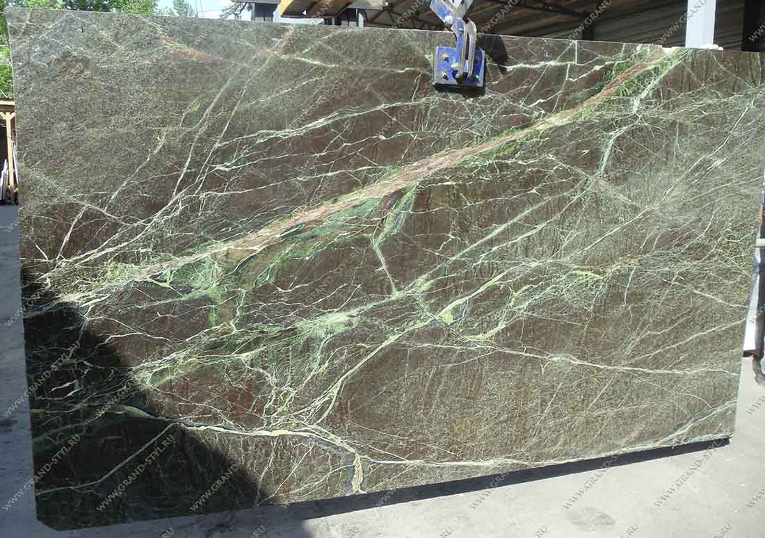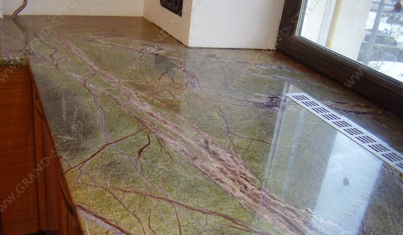 Подоконник выполнен из мрамора Бидасар Грин (Bidasar Green). Это один из ярчайших индийских мраморов, которые всегда в моде и всегда востребованы. Ярко-зеленый фон этого камня вкупе с жилами насыщенного коричневого цвета создают ощущение дорогой картины и присутствия леса. Место добычи материала - Индия.