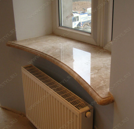 Подоконник выполнен из мрамора Дайна (Daina). Добывают его в Испании. У камня уникальный бежевый оттенок, располагающий к сочетанию с материалами любых цветовых гамм и форм в различных видах декоративной отделки. Все изделия просчитываются индивидуально по чертежам.