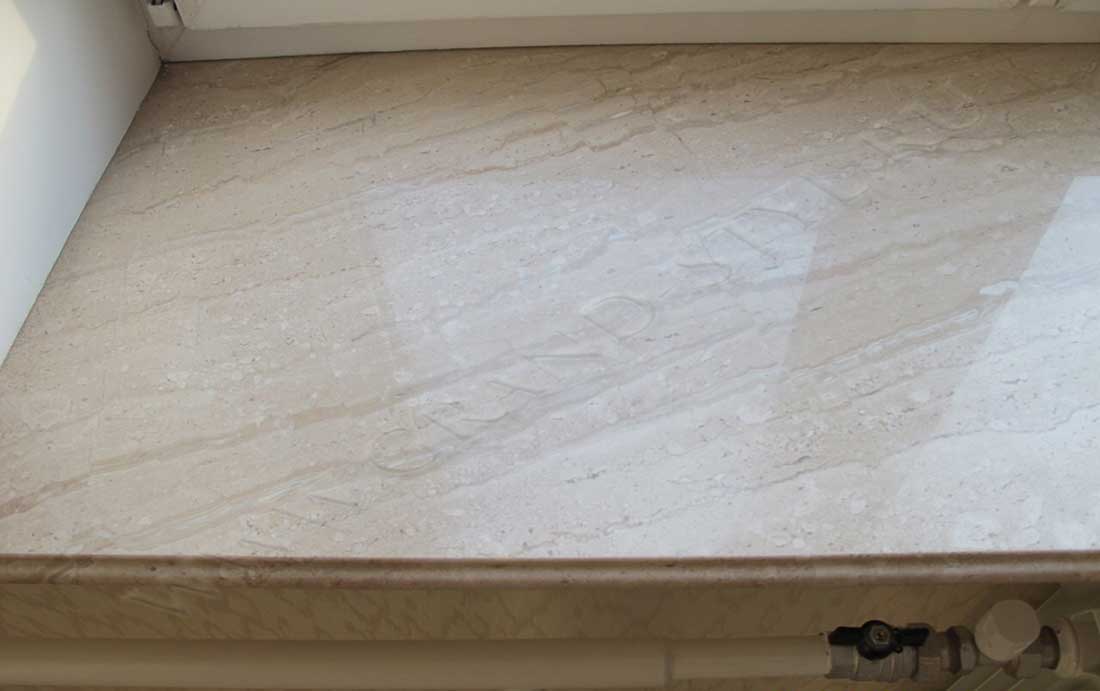 Подоконник выполнен из мрамора Дайна (Daina). Добывают его в Испании. У камня уникальный бежевый оттенок, располагающий к сочетанию с материалами любых цветовых гамм и форм в различных видах декоративной отделки.